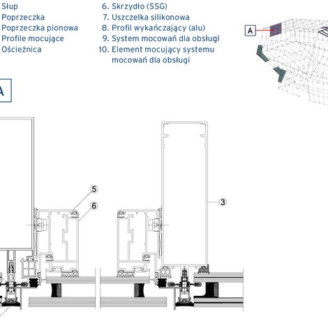A – okno uchylno obrotowe, odcinek o układzie poziomym, szczeblina