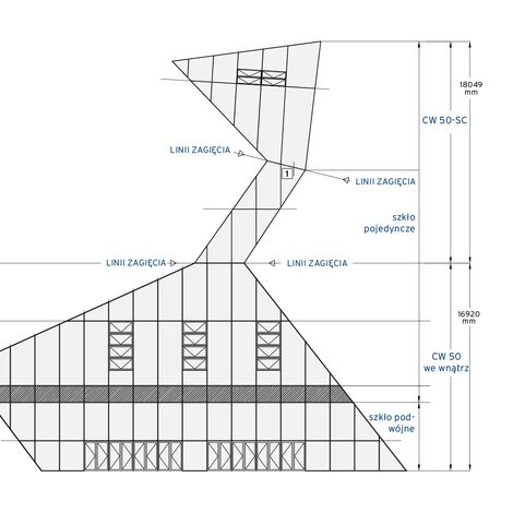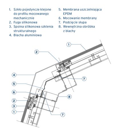 - Ze względu na duże obciążenia wynikające z pochylenia fasady wykonanie specjalnych zabezpieczeń uniemożliwiających spadnięcie szkła na doł