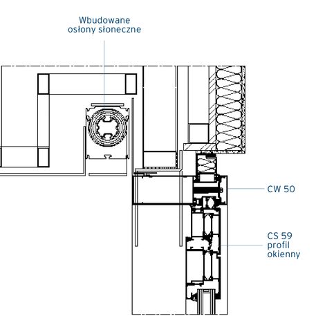 Elewacja w systemie CW 50, ze zintegrowanymi osłonami przeciwsłonecznymi
